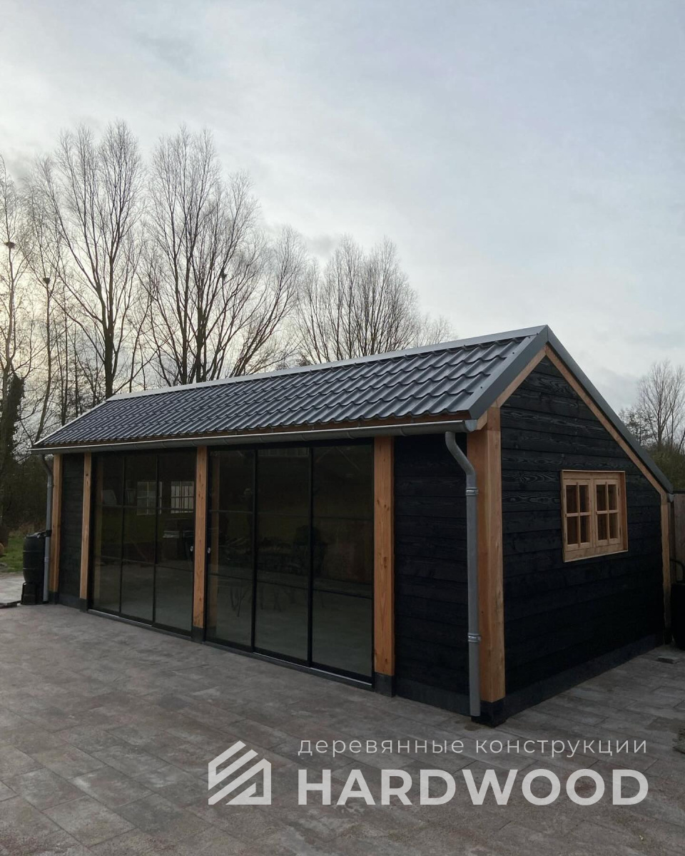Лофт вырос из индустриальной эстетики: прямые линии, понятный каркас, фактура материалов на первом плане. В беседке это выражается в открытых балках, строгой геометрии, крупном остеклении и функциональности каждой детали. Никакой визуальной «тяжести» — только то, что работает на комфорт и стиль.